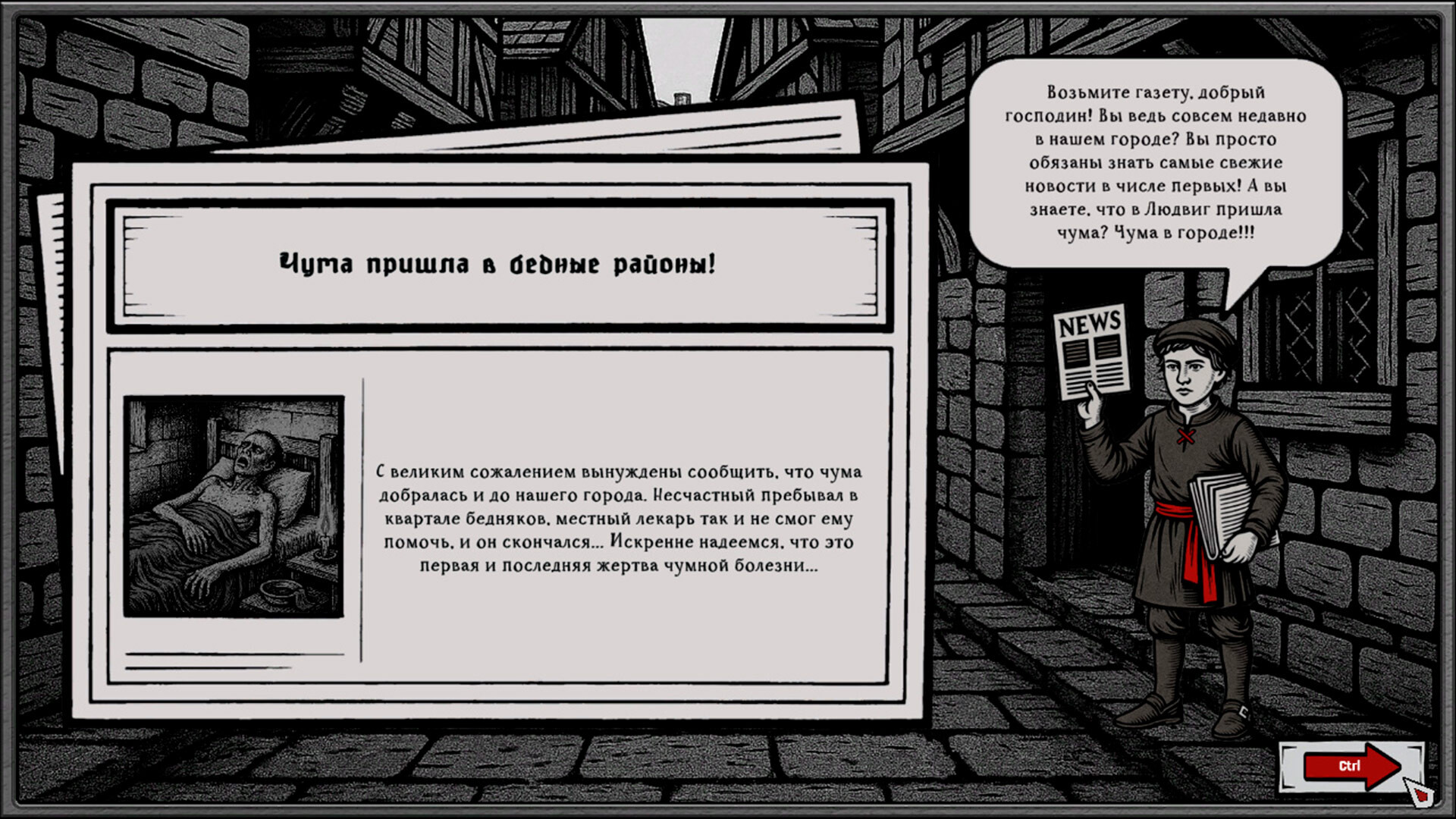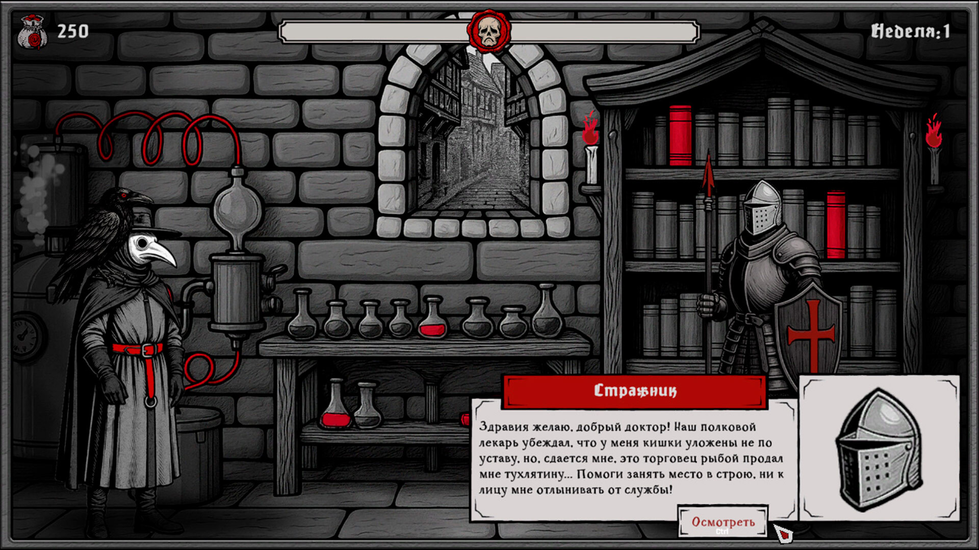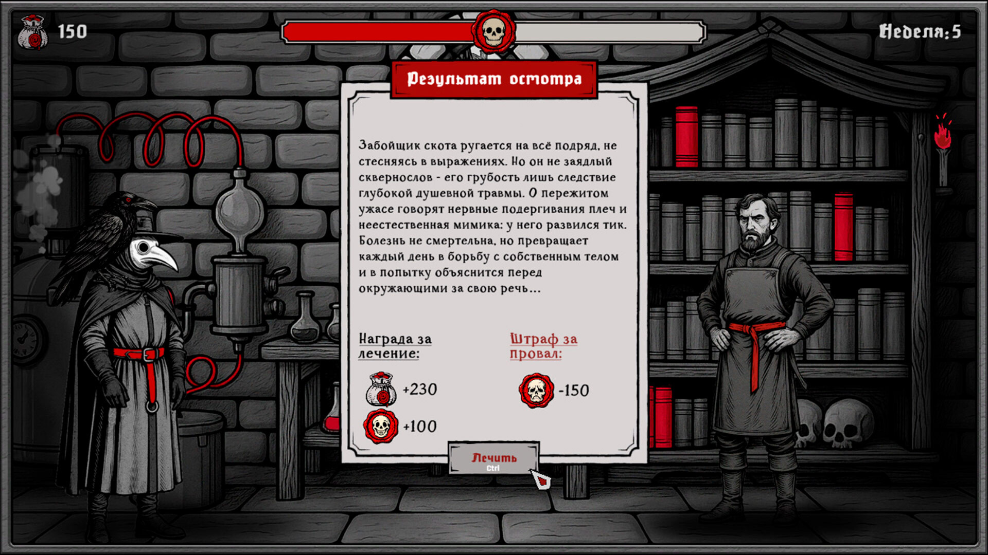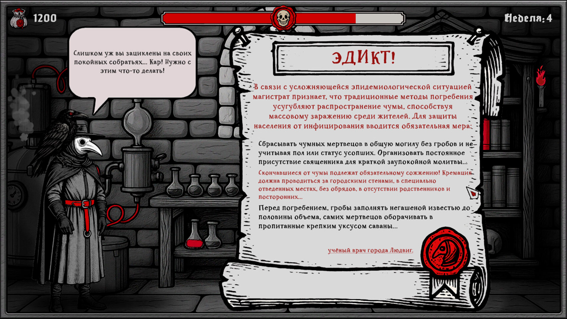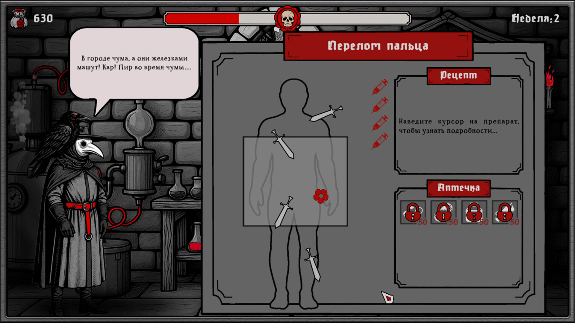 The Book of Plagues, мрачный симулятор выживания в условиях тотального мора, заставляет принимать фатальные решения ради спасения остатков цивилизации. В эпицентре катастрофы в Людвиге протагонист становится заслоном между порядком и хаосом. Повседневность наполнена врачеванием и жестким администрированием: от введения карантина до сожжения зараженных кварталов. Городское пространство разрывается между интересами Магистрата, Инквизиции и Церкви, преследующих корыстные цели. Единственным спутником в странствии по охваченным безумием улицам выступает ворон Бэйн. Птица иронизирует над происходящим, заставляя сомневаться в здравомыслии героя. Еженедельное выживание превращается в борьбу за ресурсы. Изготовление эликсиров требует точности, ведь цена ошибки исчисляется жизнями.
