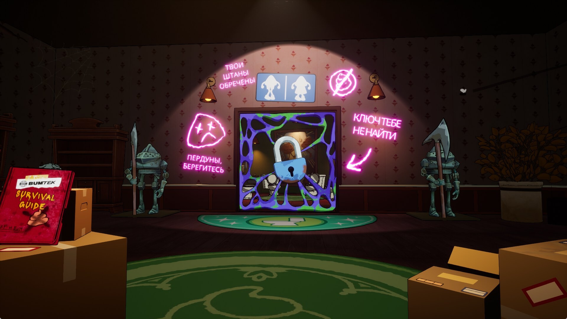 Перед стартом группа отправляется на автозаправку. Зона необходима для приобретения специфических расходников и настройки внешнего вида. Внутри темных коридоров скитаются агрессивные мумии из туалетной бумаги. Прямое столкновение с местной фауной редко приносит пользу. Найденный подручный арсенал ломается предельно быстро. Заполучив заветный ключ от уборной, компания немедленно начинает финальный забег. Ради благополучной эвакуации на фаянсовом троне геймерам придется: