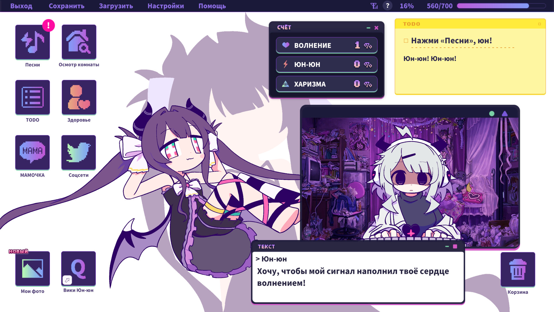 Музыкальное сопровождение проекта насчитывает свыше тридцати треков от таких исполнителей, как KOTOKO, REDALiCE и t+pazolite. Звучащие на фоне композиции вроде sakuranbokissu или Raspberry задают безумный темп повествованию. Проходя Yunyun Syndrome!? Rhythm Psychosis, геймер буквально управляет чужим разумом через музыкальные ритмы. От выбранной тактики зависят финальные последствия этой пугающей интернет-одержимости. Развитие событий способно привести вселенную либо к тотальному разрушению посредством массовой деградации, либо к полному растворению личности внутри цифровой галлюцинации. Вариативность концовок обеспечивает уникальный эмоциональный отклик при каждом новом финале.